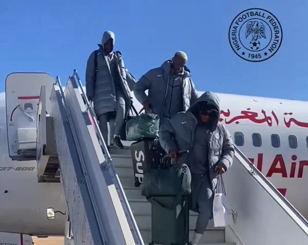 A video shared on the Super Eagles’ official X (formerly Twitter) handle showed the players disembarking from a Royal Air Maroc flight under clear skies. Dressed in matching grey puffer jackets and tracksuits, the players were seen carrying personal luggage as they descended the aircraft stairs, appearing relaxed and in high spirits. Star striker Victor Osimhen was also spotted among the squad.